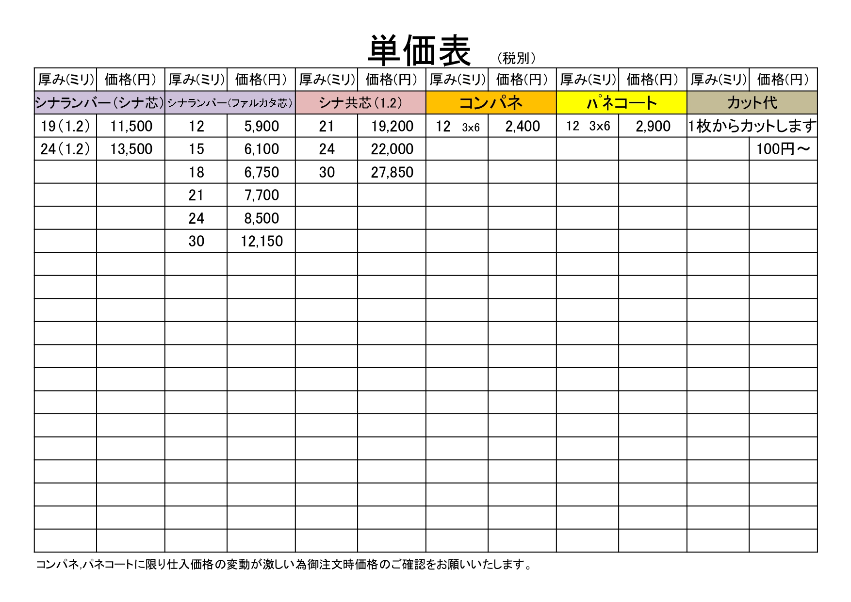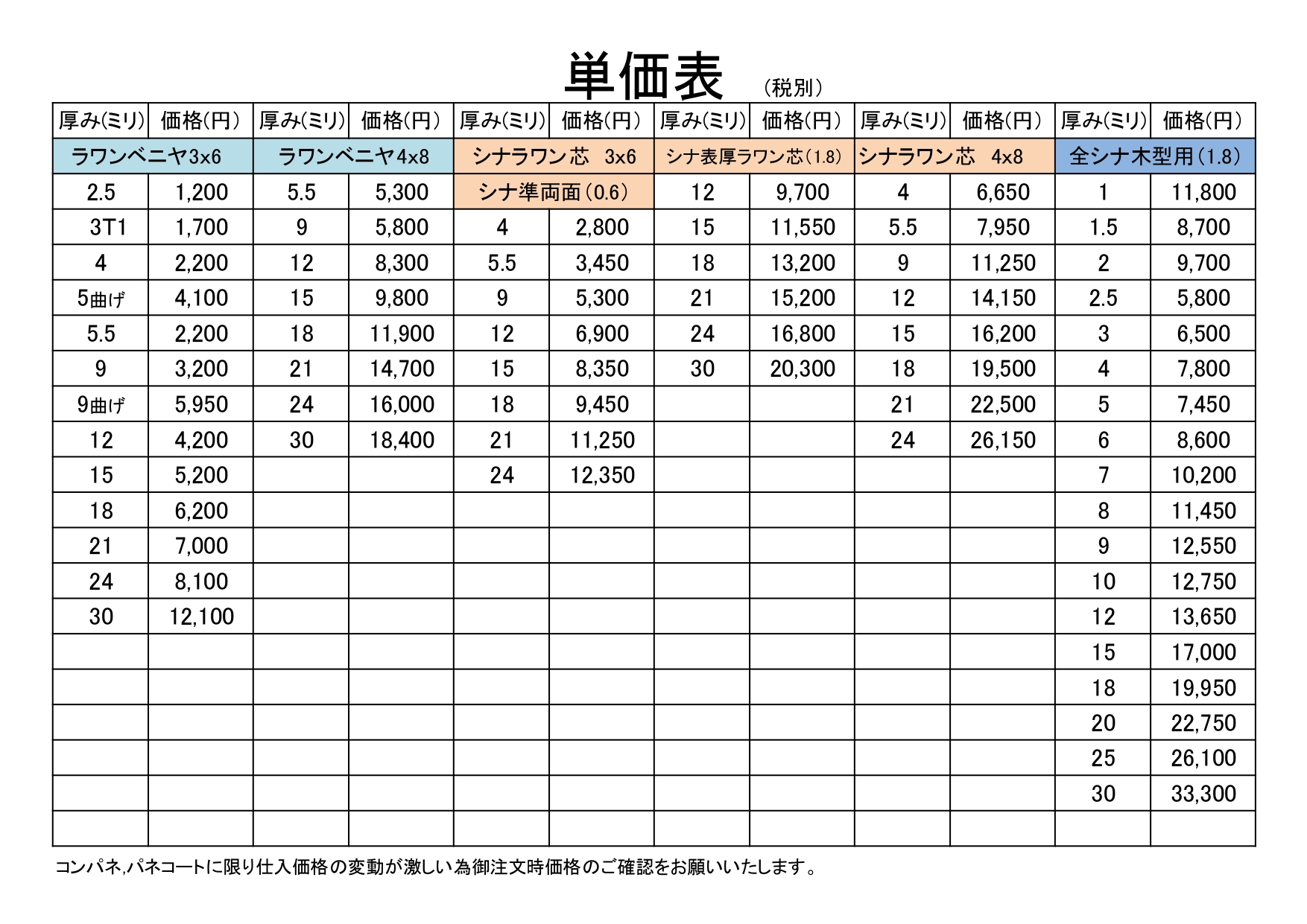 ※コンパネ、パネコートに限り仕入価格の変動が激しい為、御注文時価格のご確認をお願いいたします。